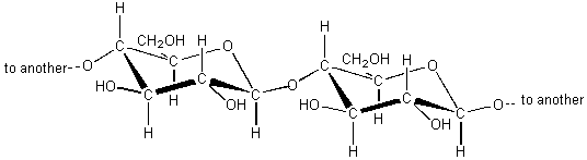A more complex, yet still similar molecule is cellulose, a molecule which is the basic component of paper. It is a very long molecule (a polymer) in which thousands of rings of six atoms each are linked together like beads. A portion of a cellulose molecule is shown below.