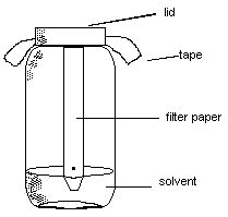 A spot of dye is placed on the paper above the level of the water. As the water moves up, the dye molecules will move with it if they are more strongly attracted to the water molecules than to the paper molecules. If the dye molecules are more strongly attracted to the paper than to the water, they will move more slowly than the water or even not at all. What if the dye is a mixture? If two or more dyes have been mixed to form an ink, then they may move at different rates as the water moves up the paper. If this happens, they will separate and we can identify them . This is depicted in the sketches below.