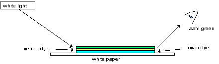 When dyes are mixed in the ink on a paper surface, light reflecting from the paper after passing through the dyes is now colored. In this example the cyan dye absorbs the red light and the yellow dye, the blue light. Only the green light is not absorbed and so the ink is seen as green.