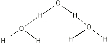 Because of this structure the oxygen end of the molecule has a small negative electrical charge and the hydrogen end has a small positive charge. Liquid water is held together by the attraction between the charges on different molecules. This is shown below for a small cluster of water molecules.